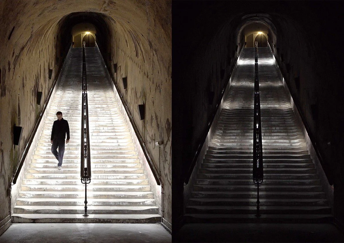 Kinematope is an installation by Pablo Valbuena at Pommery starecase in Reims. He uses animated lights and shadows to highlight architectural features, creating a new way for the audience to interact with the space .